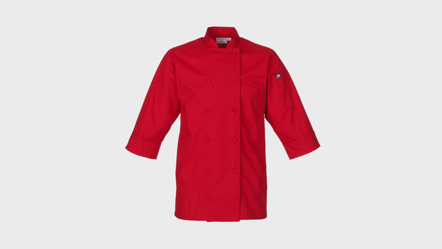 Made from a 65% polyester, 35% cotton blend, this chef coat offers the durability of polyester with the softness of cotton for all-day wearability. The double-breasted design with cloth-covered buttons exudes sophistication, while the three-quarter sleeves provide enhanced mobility without compromising coverage. Designed with practicality in mind, this chef coat features a left chest patch pocket for quick-access storage and a left sleeve thermometer pocket to keep essential tools within reach. Available in black, blue, grey, lime, navy, and red, this chef coat offers versatility and style options to match any kitchen uniform.