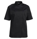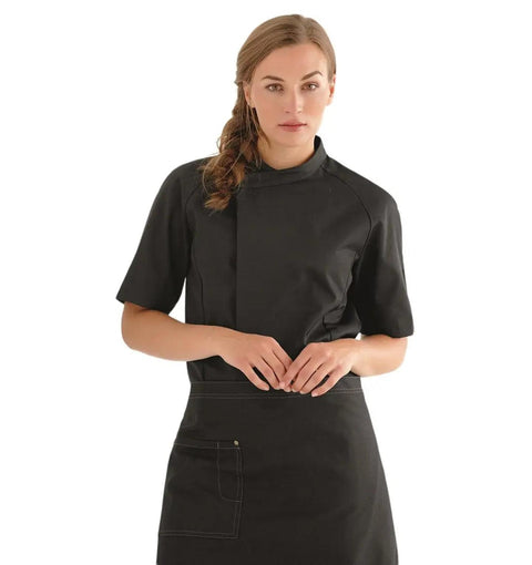 Crafted from a lightweight, breathable poly-cotton blend, this unisex chef jacket features a tailored modern fit that is flattering for female chefs. Its short sleeve design ensures enhanced mobility and cooling, while its durable construction stands up to repeated commercial laundering without fading or losing shape. Whether you're firing up a grill or plating fine cuisine, this jacket delivers all-day performance.