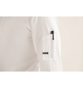 Designed to move with you, the jacket features mobility sleeves that prevent the entire jacket from lifting during arm movements and practical pull-up cuffs with elastic bands, making it easy to adjust sleeves without losing focus. Added functional details include a collar strap for easy Snap-On bib apron attachment, a divided pen pocket on the left sleeve, and side slits for enhanced flexibility and ventilation.