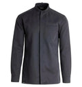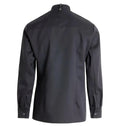 The jacket's clean silhouette is defined by a welt chest pocket, hidden press buttons with front bartacks for easy access, and a collar strap designed to securely hold a bib apron in place. Strategic tailoring elements such as a dart on the back and side slits ensure enhanced mobility and ergonomic comfort. The addition of a pull-up cuff feature adds convenience for dynamic kitchen environments, allowing sleeves to be adjusted quickly without hindrance.