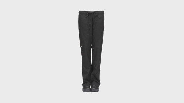 Crafted from a 65% polyester, 35% cotton blend (6.2 oz.), these chef pants offer superior durability while maintaining a lightweight feel for all-day comfort. The elastic waistband with a drawstring ensures a secure yet adjustable fit, allowing for unrestricted movement throughout long shifts. With multiple pockets, including a right-leg cargo pocket with a Velcro® flap, two front pockets, and two back pockets with Velcro® flaps, these pants offer ample storage for essential tools and personal items. Available in black only, they provide a professional and sleek appearance that pairs effortlessly with any chef coat or uniform.